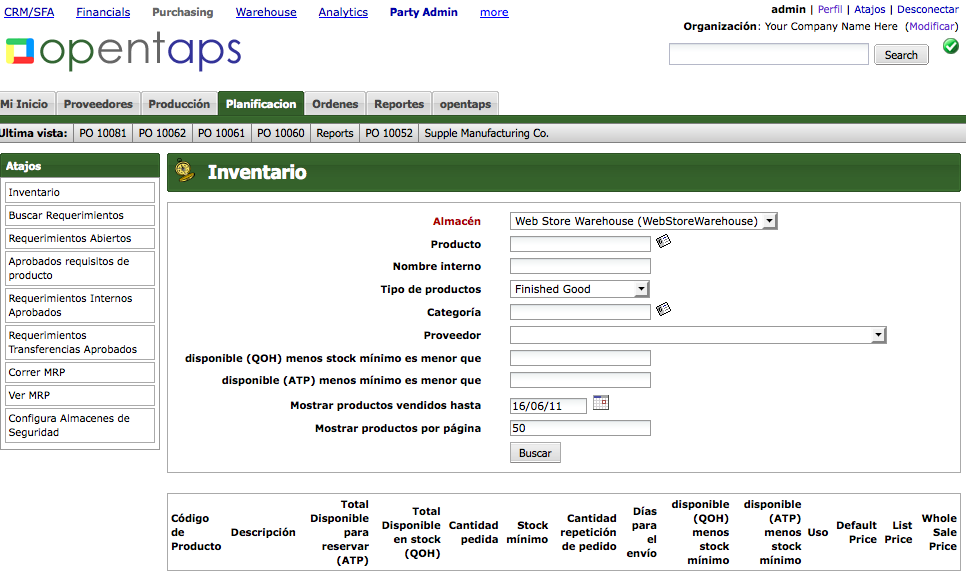 Thanks again to Stalyn Chavez of BokSoft in Peru, who has been working with opentaps, the Purchasing and Warehouse modules of opentaps have been translated to Spanish. Here’s what the Purchasing module looks like:
